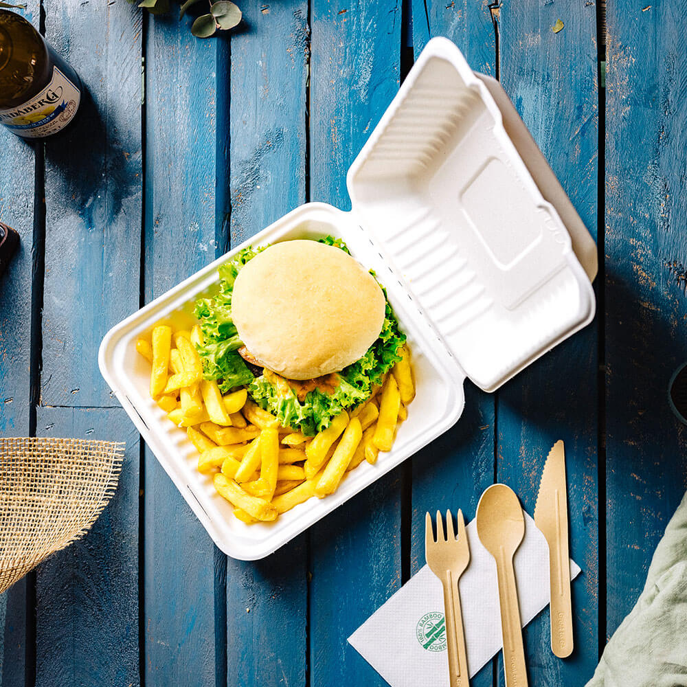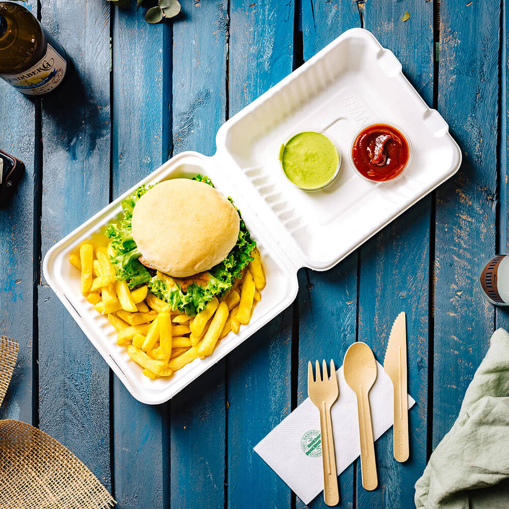 Plats à emporter dans des plateaux robustes : Les barquettes sont particulièrement adaptées à la restauration rapide et aux amuse-gueules. Même les plats gras comme les boulettes frites peuvent être emballés en toute sécurité. Comme les barquettes sont fabriquées en canne à sucre, elles sont déjà robustes par elles-mêmes et n'ont donc pas besoin d'une protection supplémentaire par un revêtement.