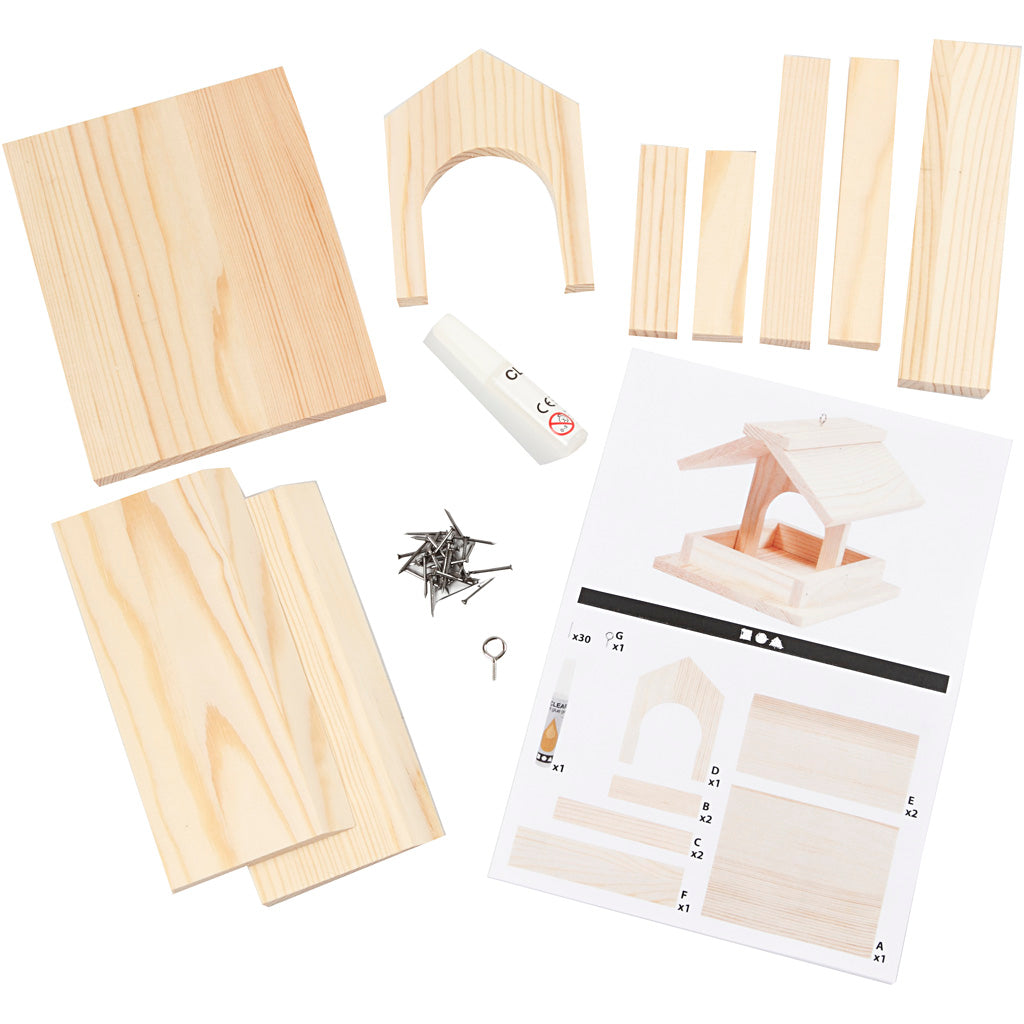 Set de matériel à assembler pour la confection d'une mangeoire pour oiseaux en bois clair. Instructions incluses