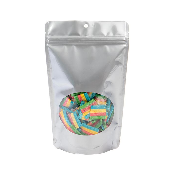Comme l'avant-première d'un film très attendu, nos sachets à fermeture éclair à fenêtre ovale argentée donnent aux clients un aperçu de votre produit avant qu'ils ne l'achètent. ZBGO3SH est notre sachet de 13 x 7,9 x 20,6 cm avec des dimensions de fenêtre de 10 x 6,7 cm Ces sachets polis de 4,8 mil peuvent contenir 113g de produits comme du café, du riz, des sels de bain et des mélanges en poudre. Les matériaux stratifiés offrent une barrière élevée pour emprisonner les saveurs et les arômes, tandis qu'une fermeture à glissière refermable garde le contenu frais après ouverture. Les sacs peuvent être thermoscellés pour être fermés. Ces sachets autoportants sont faciles à marquer avec un autocollant ajouté, une étiquette ou un design personnalisé.