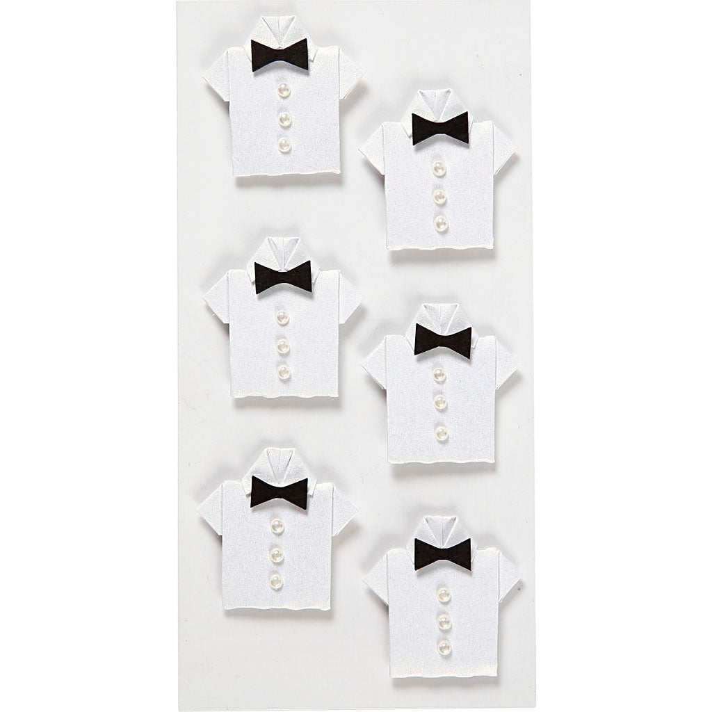 Stickers a forma di camicia con cuscinetto adesivo sul retro per un effetto 3D. La camicia è piegata come un origami, con dettagli extra fini in carta bianca, ha un cravattino nero e piccole gemme che simulano i bottoni.