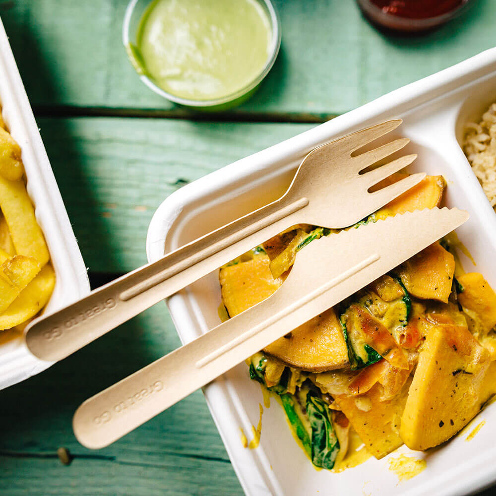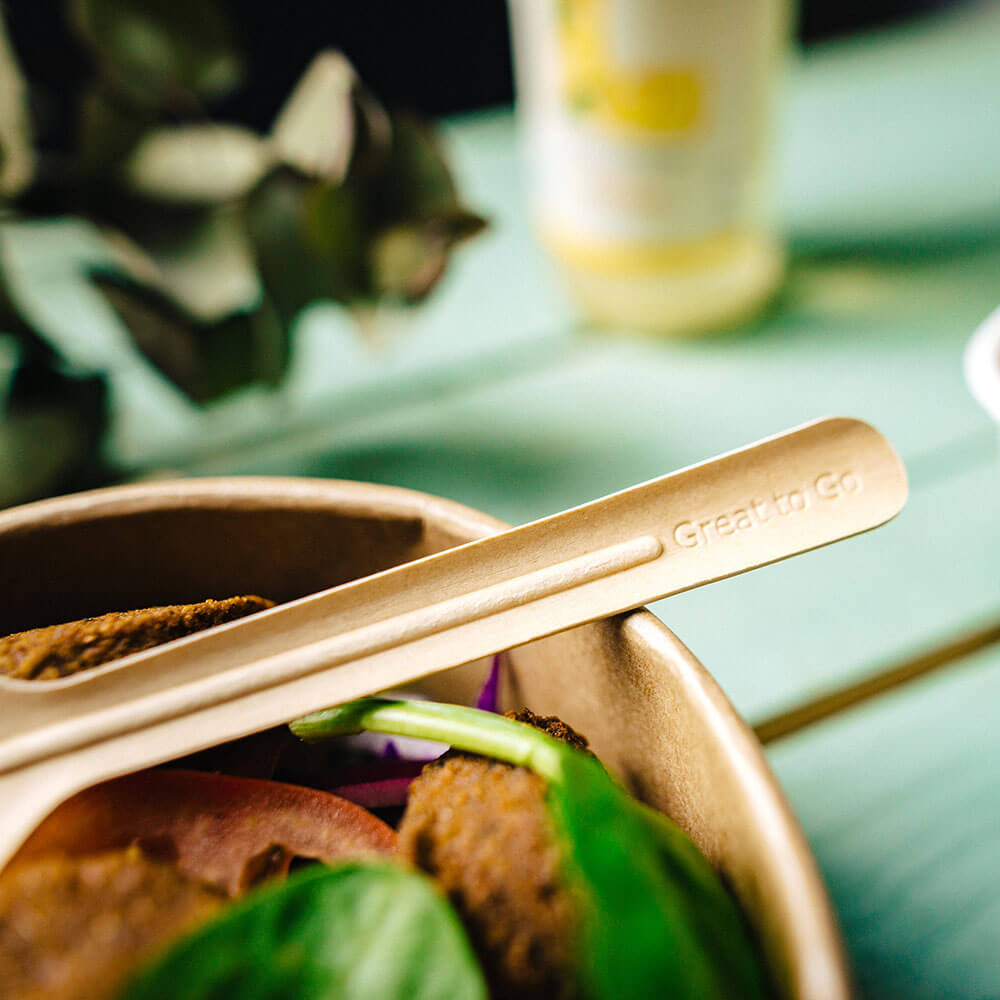 Das papierbraune Aussehen verleiht den Gabeln außerdem einen umweltfreundlichen Look. Der Griff ist mit der Prägung "Great to go" versehen. Darüber hinaus ist dieses Produkt auch als Löffel und Messer erhältlich.