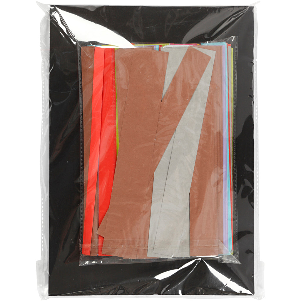 Set mit gewebten Rahmen aus strapazierfähigem Karton in Schwarzweiß und Streifen aus zweifarbig bedrucktem Papier in kräftigen Farben u. verschd. Breiten. Inhalt: 25 Webrahmen in Schwarzweiß u. 960 Stck. beidseitig bedruckte Streifen zum Weben in 4 Breiten u. 20 Farben.